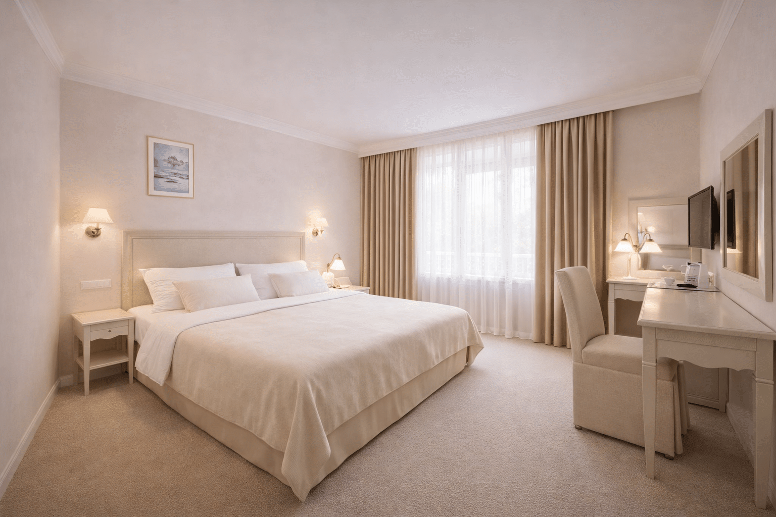 Сегодня у нас действует специальное предложение: номера категории Комфорт по цене всего 59 евро за ночь (без завтрака). Это отличная возможность остановиться в уютном отеле высокого уровня по действительно привлекательной стоимости. Просторные номера оформлены с учетом современных стандартов комфорта: удобные кровати, стильный интерьер, приятная атмосфера уюта и все необходимое для полноценного отдыха после прогулок по курорту.